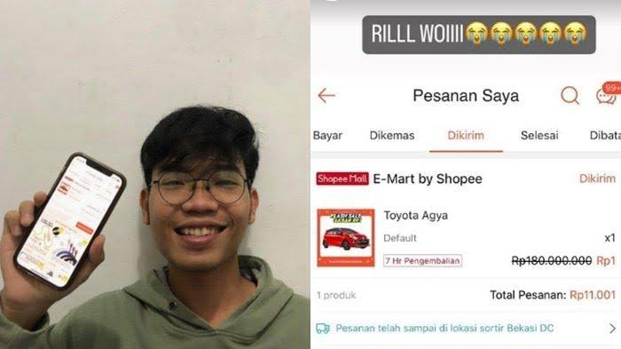 “Udah prepare mau tidur, iseng lihat flash sale ada mobil satset langsung checkout. Eh dapat Toyota Agya seharga Rp 11.001. Thank you @shopee_id” tulisnya bersama foto dirinya yang sukses melakukan check out mobil tersebut.